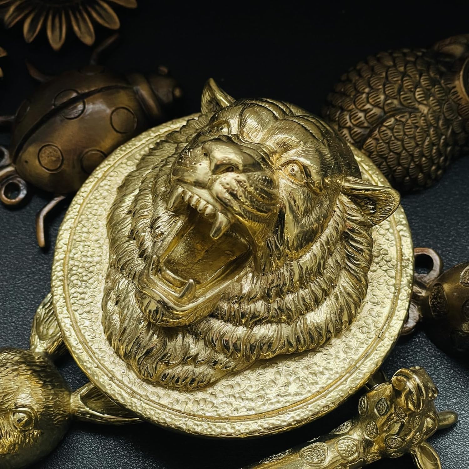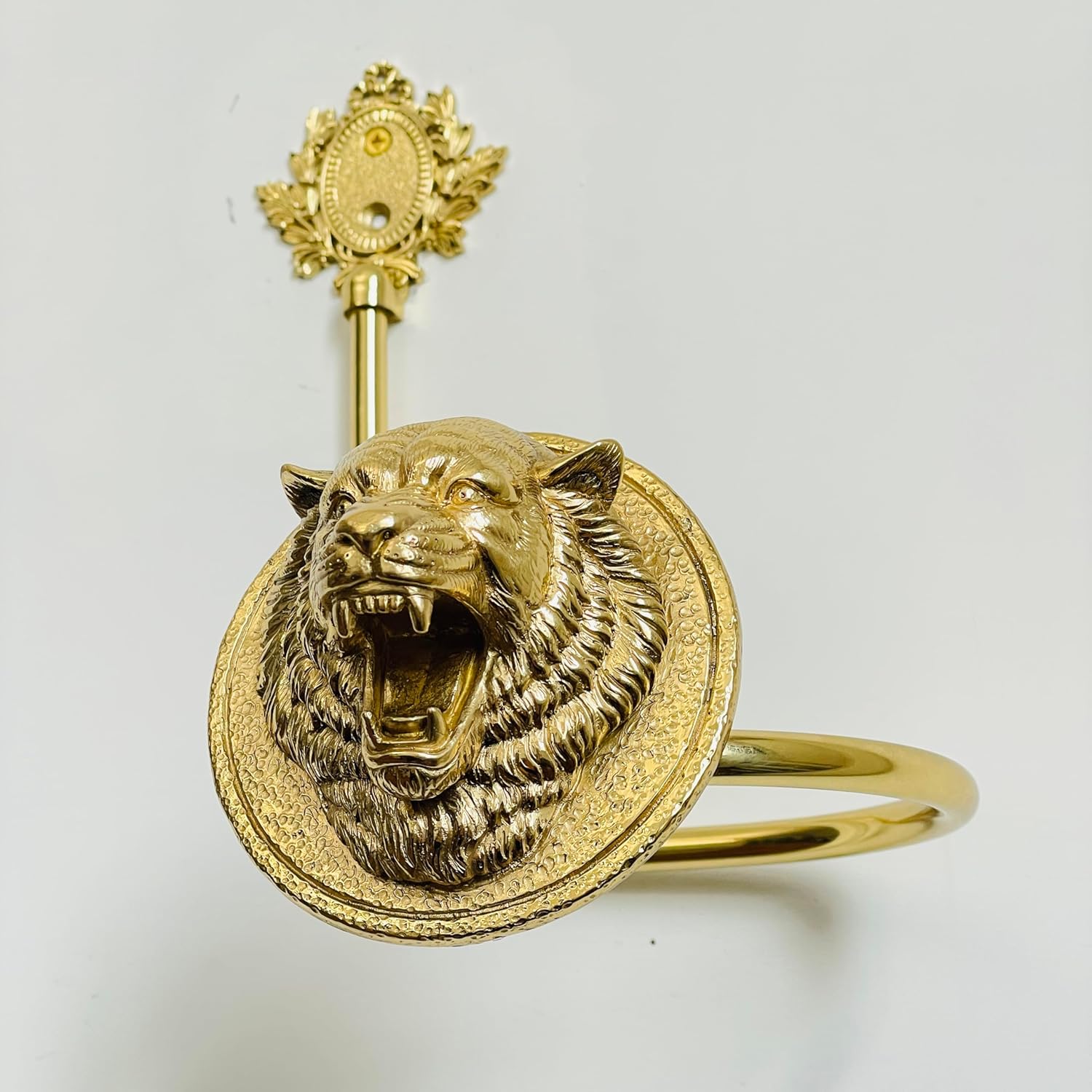 Add a touch of regal elegance to your home decor with this stunning gold brass curtain holdback featuring a majestic tiger head design. The intricately detailed tiger face, cast in premium brass with a luxurious gold finish, creates a bold statement piece that serves both form and function. The decorative wall hook combines classical architectural elements, including a beautifully crafted leaf motif crown, with the dramatic impact of the fierce tiger medallion. This substantial curtain swag holder not only secures your drapery with style but also doubles as an impressive wall accent. The curved arm extends gracefully from the mounting plate, providing ample space to gather and hold your curtains. Perfect for formal living rooms, studies, or any space where you want to make a sophisticated yet dramatic design statement. The durable brass construction ensures long-lasting performance while maintaining its striking appearance.