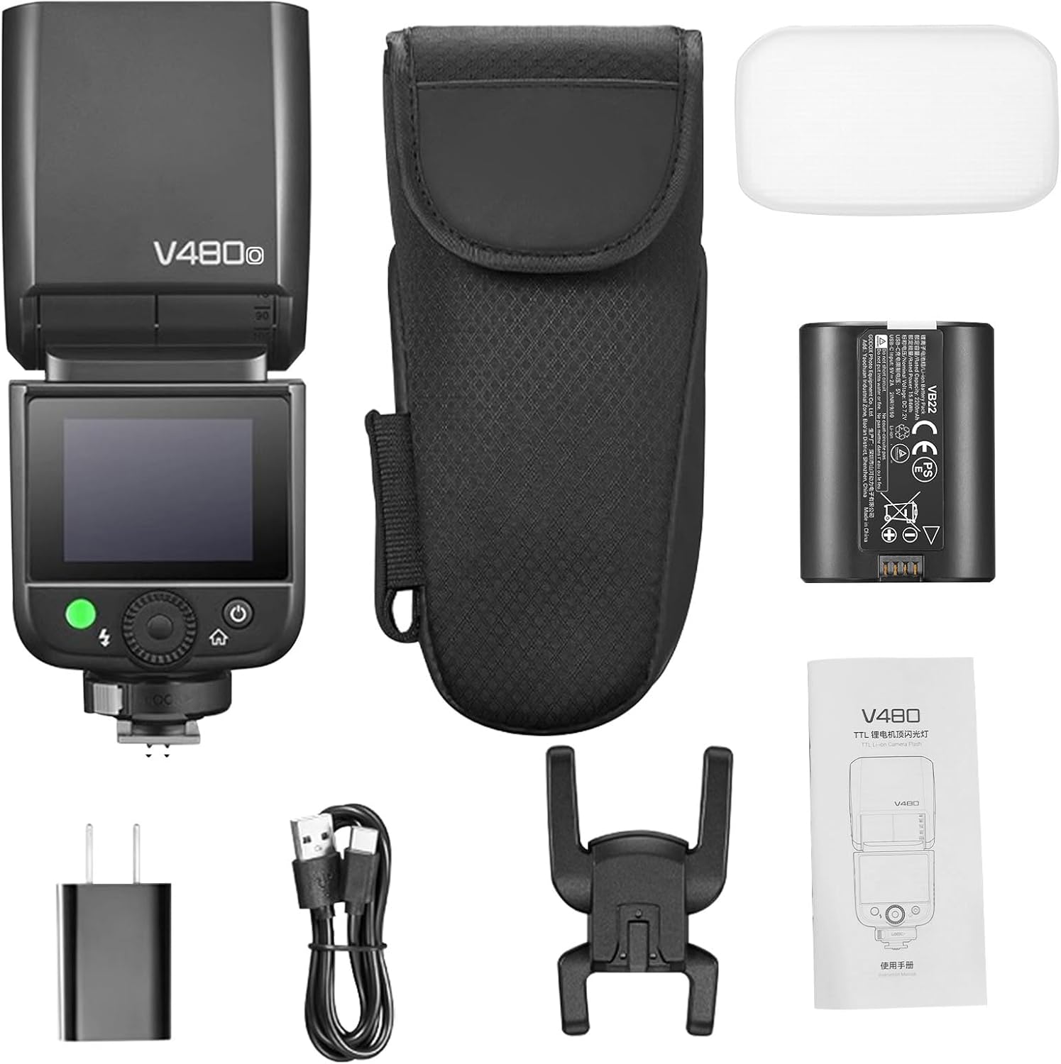 Specification: Item Type: Camera Flash Material: Plastic Size: Approx. 16.6 x 7.1 x 4.9cm/ 6.5 x 2.8 x 1.9in Weight: Approx. 361g/ 12.7oz Model: V480 O Flash Guide Number: (1/1 stop, 105mm lens setting): Approx. GN50 (ISO 100, in meters) Flash Coverage: Automatic adjustment (automatically sets flash coverage to suit the lens's field of view and image size); Manual adjustment (24-105mm) Light Head Rotation Range: Flash can rotate/tilt, horizontally 0° to 330°, vertically -7° to 120° (bounce flash) Flash Duration (t0.1): 1/600 sec. to 1/20,000 sec. Exposure Control System: TTL autoflash, manual flash Flash Exposure Compensation (FEC): ±3 stops in 1/3-stop increments Sync: High-speed sync (up to 1/8000 sec., global shutter cameras can achieve up to 1/80,000 sec.), first-curtain sync, second-curtain sync Stroboscopic Flash: Available (maximum number of flashes: 100; maximum flash rate: 100Hz) Wireless Flash (2.4G wireless transmission) Wireless function: Master unit/Slave unit Transmission range (approx.): 100m Channel: 32 groups: 01-32 ID: OFF/01-99 Recycling time: Approx. 1.7 seconds, flash ready, recycling indicator illuminates Number of flashes (1/1 steps): Approx. 650 Energy saving: Standby/auto power off function Sync triggering method: Hot shoe, 2.5mm sync cord LED modeling light Power consumption: 2W Color temperature: 5300K ± 300K Power source: Lithium battery Battery: 7.2V/2200mAh (included) PackageList: 1 x camera flash 1 x mini base 1 x lithium battery 1 x storage bag 1 x softbox 1 x charger 1 x manual 1 x Type-C charging cable